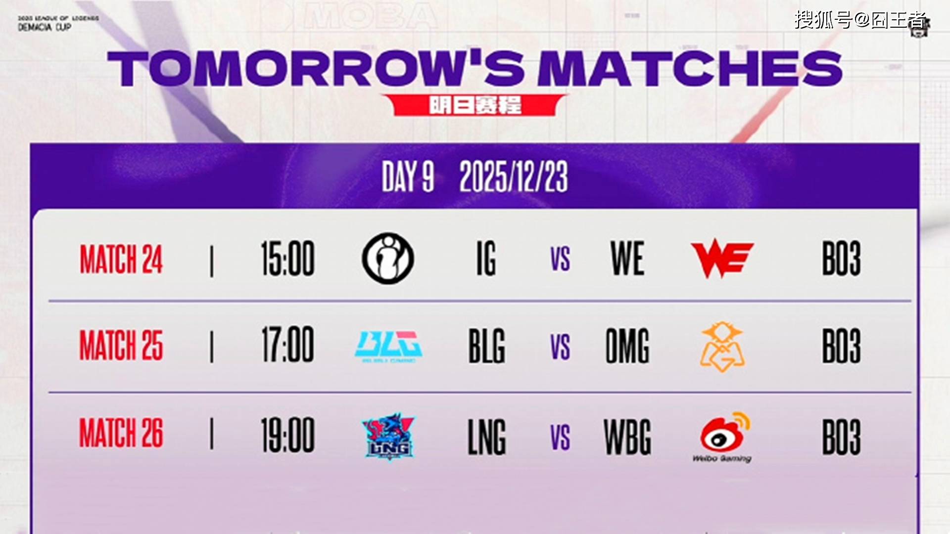 12月23日,三场比赛由IG对阵WE,BLG对阵OMG,以及LNG对阵WBG带来。他们谁又会笑到最后呢,让我们拭目以待。
