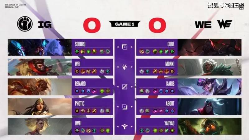 第一局比赛,IG蓝色方,禁用:沙皇、石头人、发条、牛头、潘森,选用:Soboro雷克塞;Wei猴子;Renard岩雀;Photic希维尔;Jwei芮尔;WE红色方,禁用:杰斯、妮蔻、兰博、洛、女枪,选用:Cube赛恩;Monki狼母;Karis辛德拉;About韦鲁斯;yaoyao泰坦