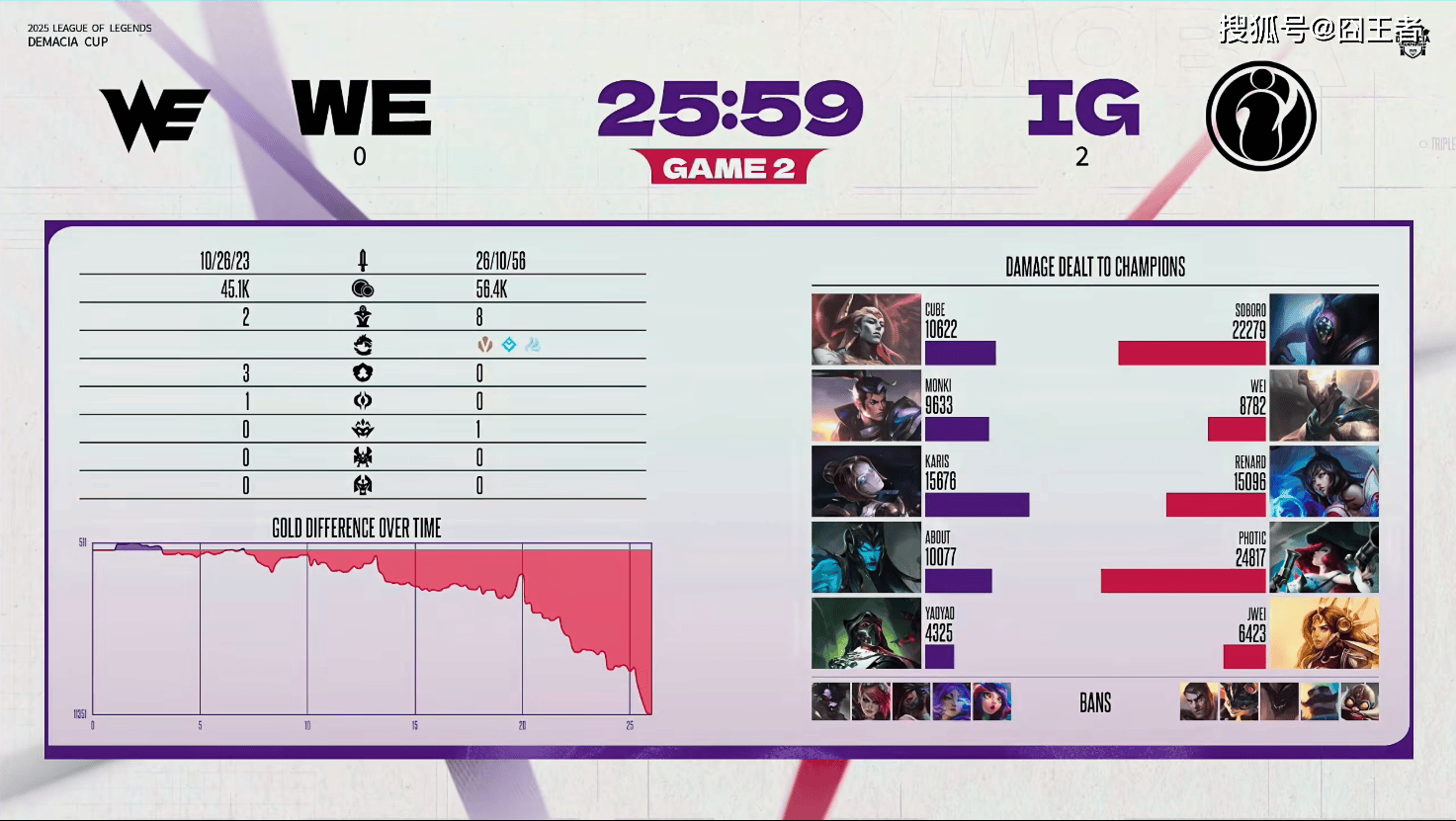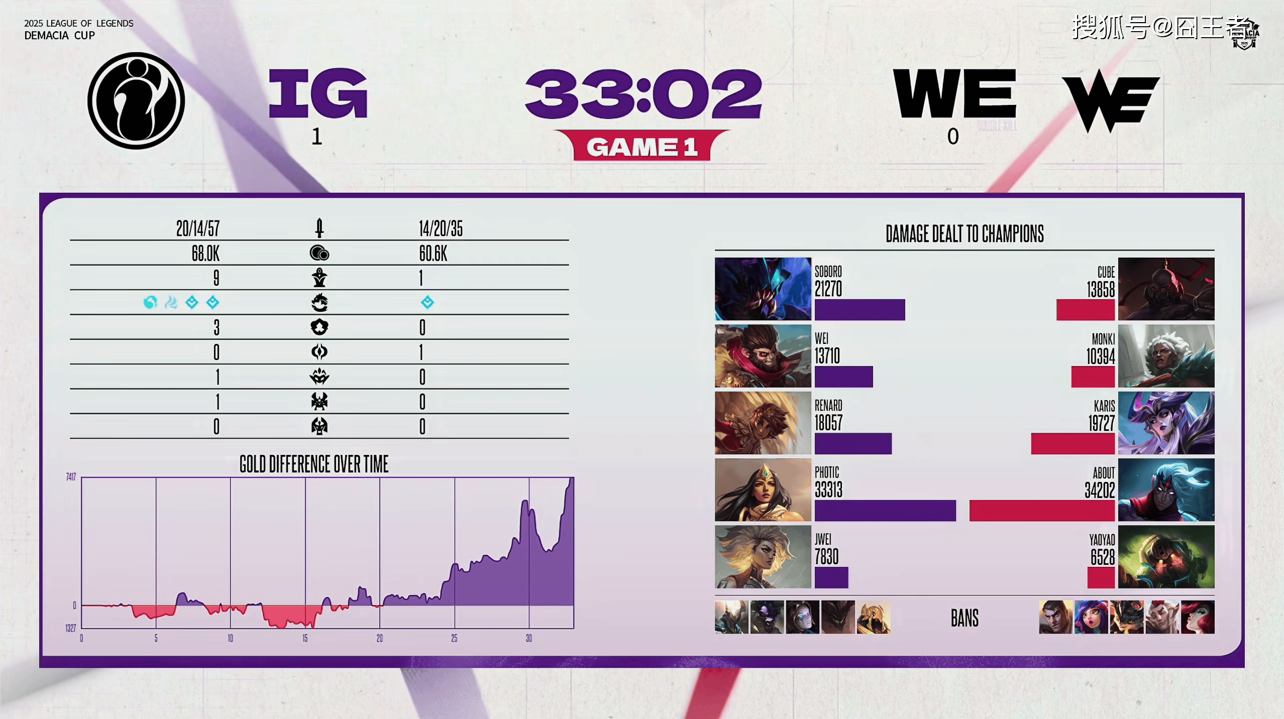 结果第一局比赛,两队在前15分钟,打得比较胶着,经济交替领先。9分钟左右:Soboro雷克塞越塔单杀About韦鲁斯,随后被WE野辅收掉人头;12分钟左右:Cube赛恩大招支援,WE打出0换3多人丝血逃生;24分钟左右:IG关键眼位抓住韦鲁斯破绽,开团击杀两人拿下厄塔汗和听牌小龙;29分钟左右:IG拿下大龙再杀两人,并成功拿下龙魂;最终33分02秒,IG团灭WE,先赢一局!