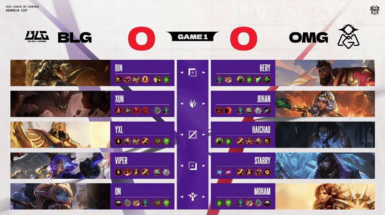 BLG本次德杯中除中单位置之外派出全部主力,Viper也登场比赛,正常来说BLG的配置还是遥遥领先于其他队伍的,而OMG战队则是转会期无人问津的状态,组建出的新配置也没人看好,上单Hery,打野Juhan,中路Haichao,下路是Starry和Maham。