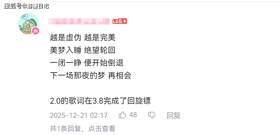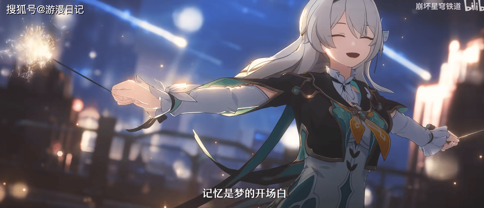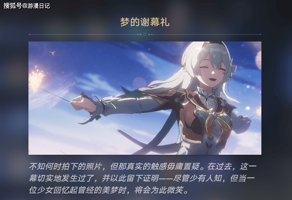 那些曾被认为只是烘托氛围的歌词与画面,在 3.8 版本主线的真相揭晓后,全都成了精准的剧情预言。比如《不眠之夜》38 秒处流萤玩烟花的经典场景,配文歌词 “记忆是梦的开场白”,不仅与 3.8 版本的主线标题 “记忆是梦的开场白” 完全呼应,这段画面更是玩家获得的宝贵道具“梦的谢幕礼”的封面。