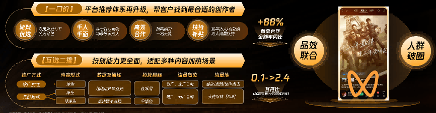 内容方面,游戏在研发阶段,可以借助腾讯广告达成IP合作,“先声夺人”地获得一定受众优势;版更/节点大推时,短剧、代言人、体育/直播节目等跨界资源,能够进一步扩大游戏声量、集中获客;常态化营销阶段,还可以通过视频号互选功能获取优质UGC素材,利用“互选二推”机制继承自然流量数据,提升买量转化效率。