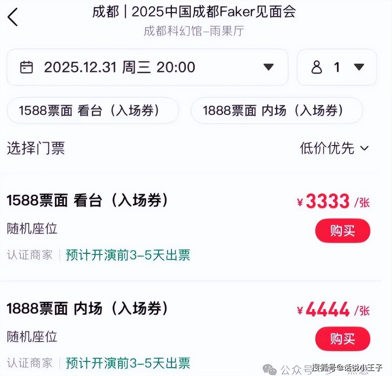 在中国成都举行Faker粉丝见面会,那作为粉丝必然是很欢迎的。只是没有想到这个门票会这样贵,看台券的门票高达1588,内场则是达到了1888。再往后就是分成ABC3种套餐,这三种套餐分别是6988,4988,2988。很多粉丝看到这个门票价格瞬间懵了,谁也没有想到会这么贵。如果明星举办演唱会的话,那么第1排的门票价格可能也就是1588。但是到了Faker粉丝见面会这里,1588也只是门槛。