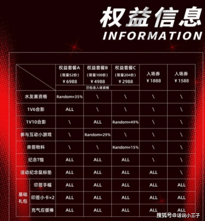 这么贵的门票,本想着买的人应该不是特别多,但是谁能想到开票后数秒内所有门票就被抢光了,包括ABC3种套餐。A套餐它的价格最贵,那么其中的福利肯定是和其他套餐不一样的。选择A套餐是有35%的机会被抽中水友资格赛,并且可以和选手进行合影,还可以参加互动小游戏,亲自获得签名。尽管如此,售价6988也还是太贵了,这要是换成LPL的队伍,不敢想象会被说成啥样。
