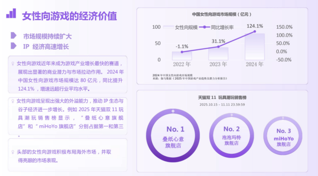 最近中国音数协、游戏工委联合发布的《女性向游戏调研报告》显示,2024年,中国女性向游戏市场规模已达80亿元,同比增长124.1%,增速远超行业平均水平,女性向游戏已成为国内游戏市场增长最快的板块之一。