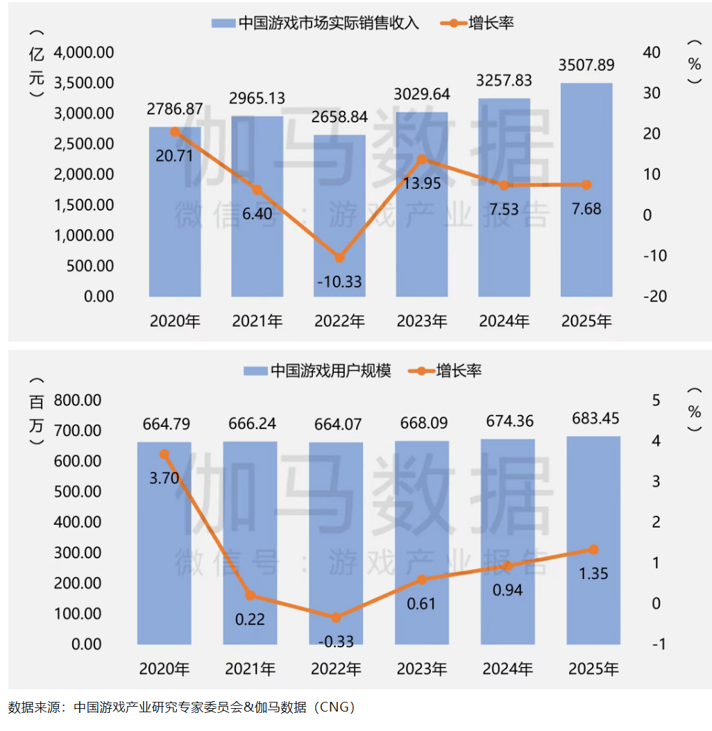 12月19日发布的《2025年中国游戏产业报告》却给了出人意料的数据:2025年,国内游戏市场实际销售收入3507.89亿元,同比增长7.68%;用户规模6.83亿,同比增长1.35%。同为历史新高点。