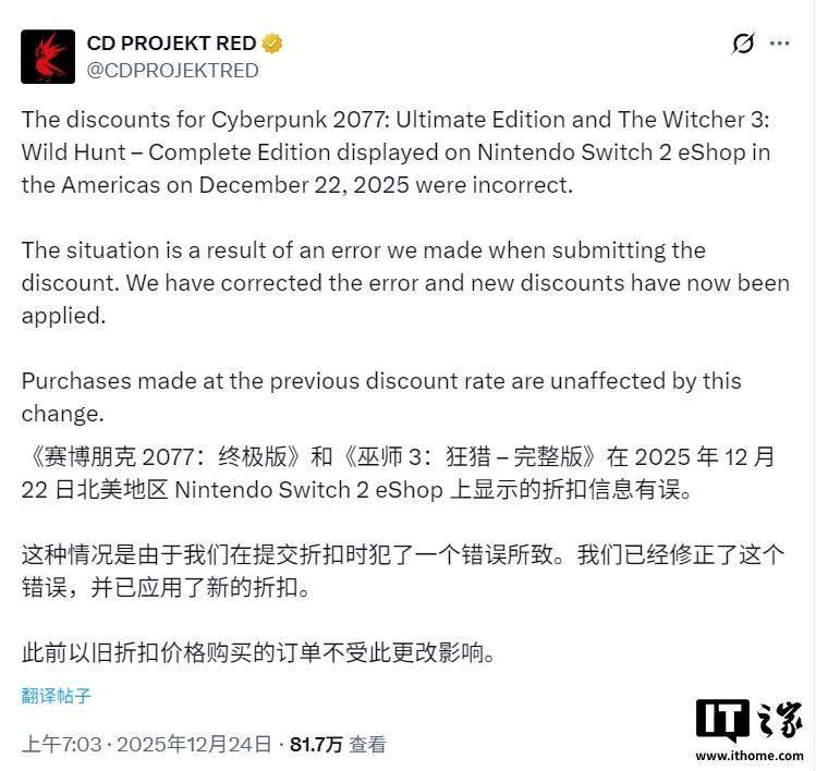 CD PROJEKT RED 官方今日发文澄清,《赛博朋克 2077:终极版》和《巫师 3:狂猎 – 完整版》在 2025 年 12 月 22 日北美地区 Switch 2 eShop 上显示的折扣信息有误。