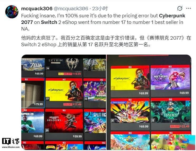 根据玩家晒出的截图,《赛博朋克 2077:终极版》错误打折后,在北美 Switch 2 eShop 商店的销量排名从第 17 名迅速跃升至第 1 名。