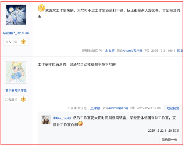 而另一派玩家,则担心“装备全靠刷”的规则下,游戏中优秀的刷怪资源点会被工作室垄断。不过也有玩家表示,就喜欢工作室来刷,大号打不过工作室还是打不过,反正都是杀人爆装备,肯定捡菜的杀。