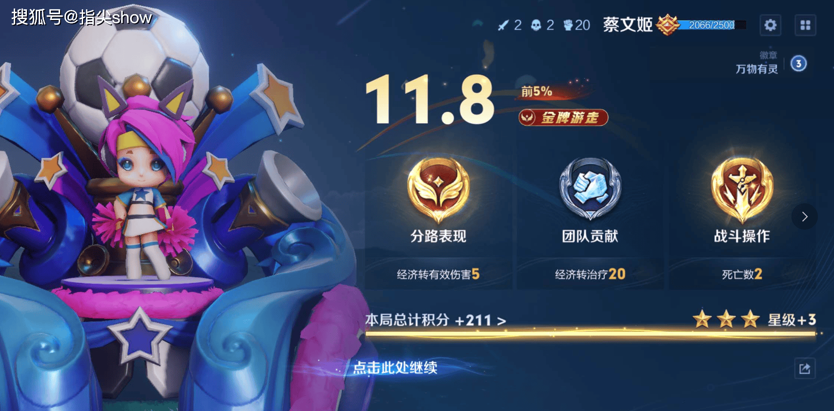 总结:通过蔡文姬平均拿高分的各种指标可以看得出她的玩法,主动承伤、多参团、多奶队友,然后尽量别死就好,这对于蔡文姬来说每一项似乎都是唾手可得的数据,也因此才比较容易拿到高分,甚至金牌吧。