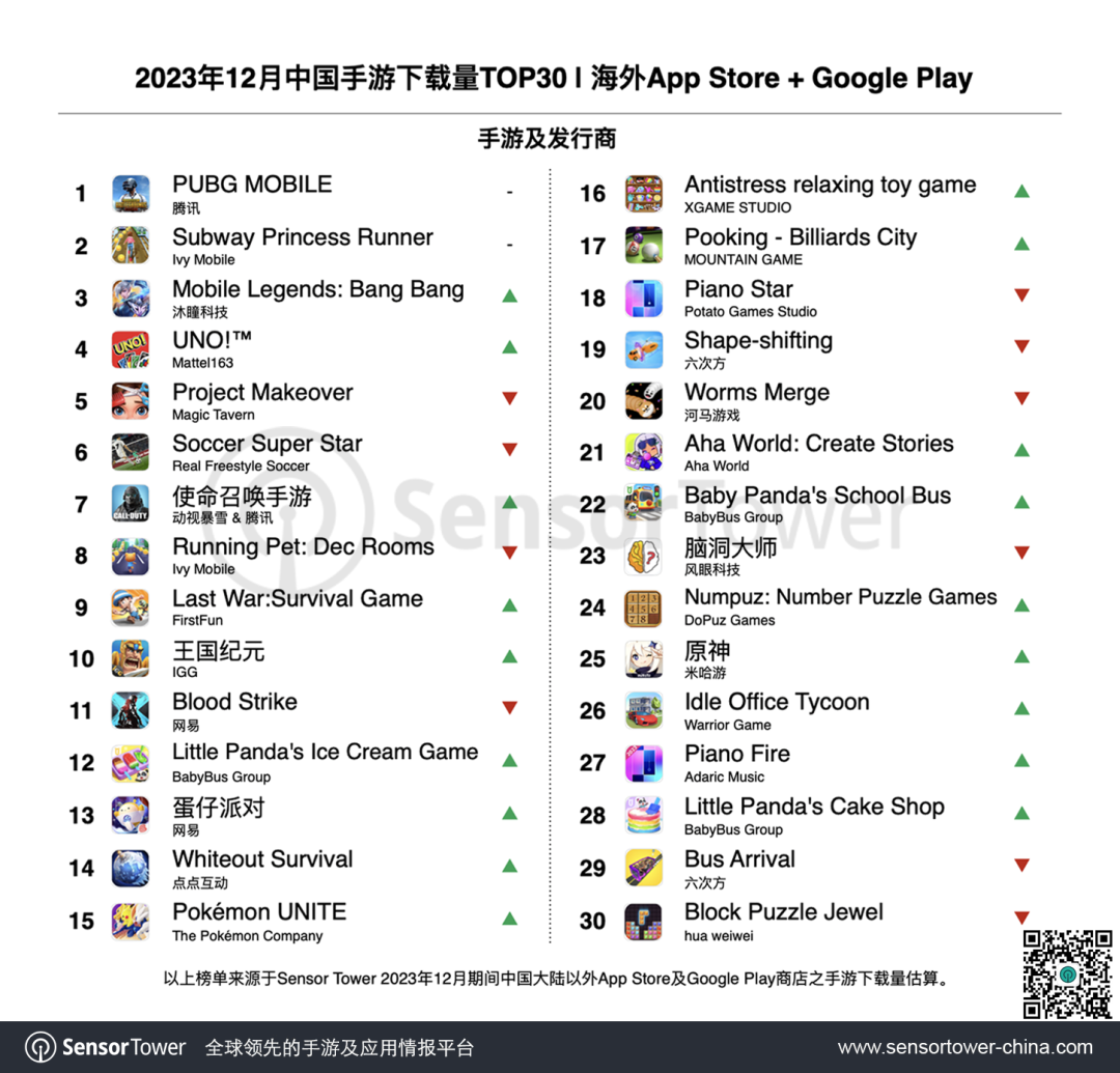 1月9日,Sensor Tower公布了去年12月中国手游出海收入及下载量排行榜,详细榜单变化如下。