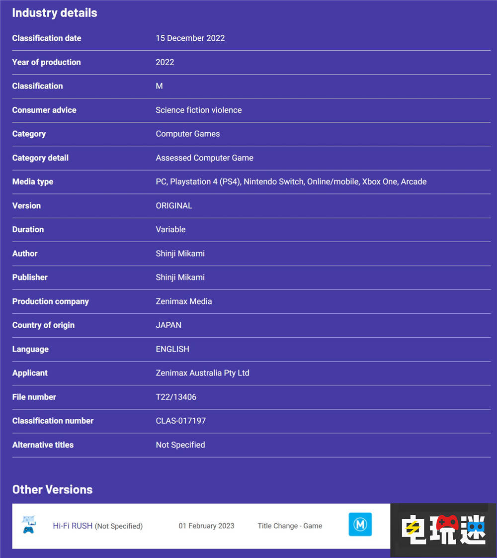 在澳大利亚的评级网站上,这个名叫“Project 2022A”的游戏项目被定义为“M级”其中包括了一些脏话内容。根据旗下对于游戏的描述,这款“节奏战斗,包含机器人与人类角色战斗”的游戏就是《完美音浪》。在游戏的介绍页面直接就有着《完美音浪》的链接。