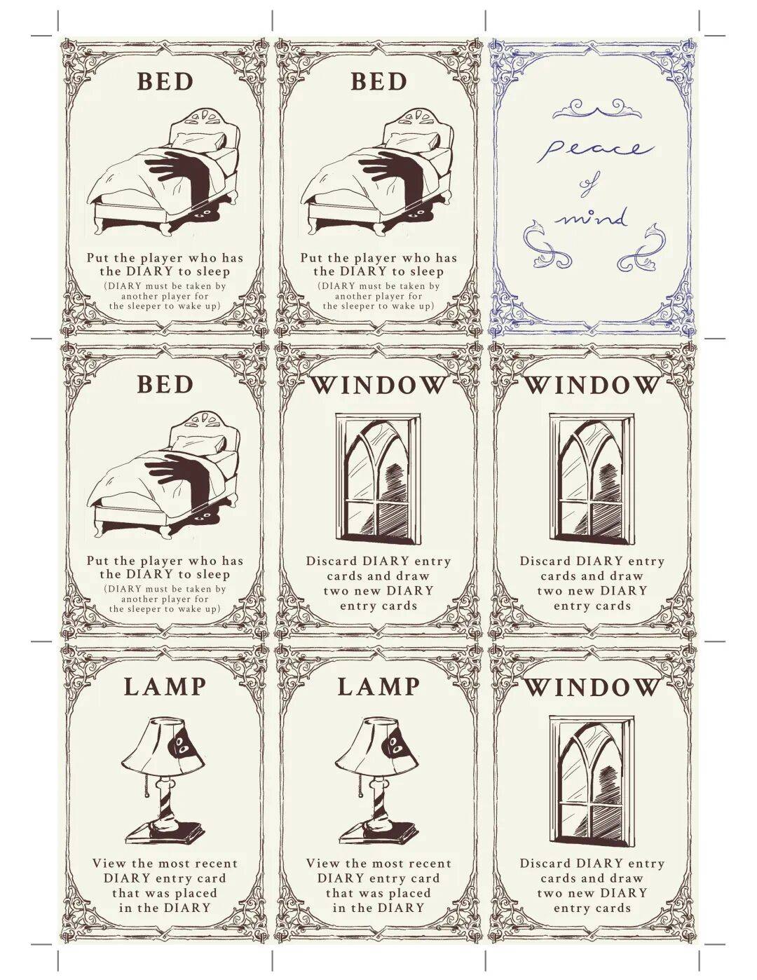 在这个机制下,桌子中央放置了一个日记盒子,各阵营玩家的目标是将代表自己阵营的日记牌放入其中。原著中的家具则作为功能牌,比如床代表睡觉,如果对玩家使用床,他就被迫进入休息状态,无法在本回合往日记里放牌。