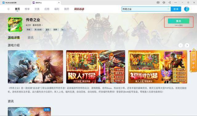 启动模拟器,在游戏中心搜索“传奇之业”,点击预约,待游戏上线后即可开启征途;