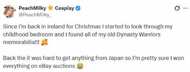 适逢12月25日圣诞节,返乡爱尔兰过节的她在整理童年卧室时,偶然翻出了一箱承载青春记忆的《真三国无双》正版周边收藏。这份突如其来的"回忆杀"让她兴奋不已,随即在社交媒体上与粉丝分享了这份珍贵的童年印记。