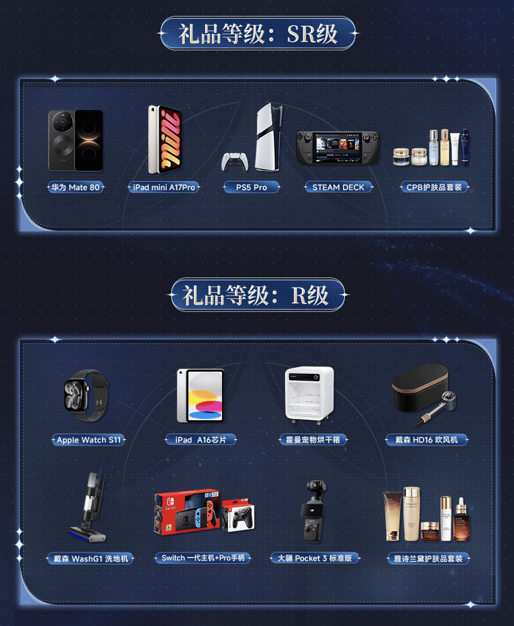 UR和SSR级别的奖品价格相差不大,分别为万元和8000元左右,类型包括苹果手机/平板、华为手机、5070Ti显卡、护肤品、音响和10克黄金。