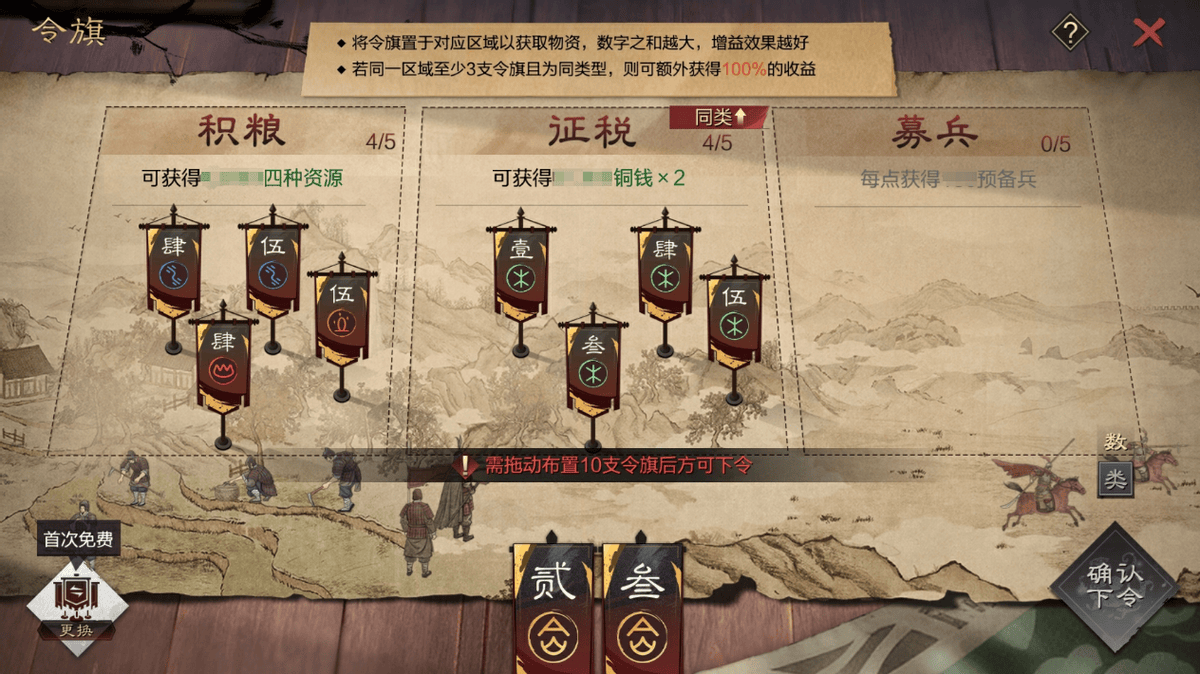更有意思的是,只要同一任务里凑够3支同类型令旗,收益直接翻倍,相当于获得了 “后勤外挂”。要是抽到的令旗点数太拉胯也不用慌,首次更换免费,也可以花20虎符刷新,总能凑出最心仪的组合。后勤资源充足,这也符合法正 “既要打得赢,又要吃得饱” 的作战理念。