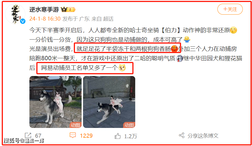 事情还得从《逆水寒》手游最近更新的爆款坐骑“伯力”说起,为了让这条哈士奇坐骑拥有鲜活可爱的姿态。官方居然不惜成本给伯力安排了动补。动物的动补本身就难度很高,制作组为了让狗听指令,也跟着狗在动补房里上下翻飞,据说陪跑800米跑了一整天!