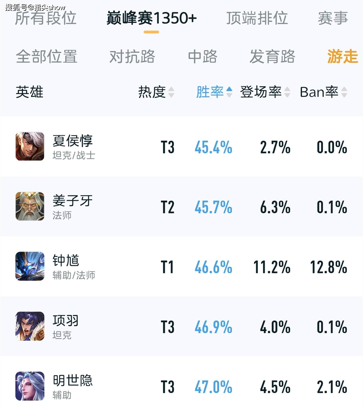 夏侯惇不管是打野还是边路都是垫底,辅助更是没人用,姜子牙大都中路,项羽是边路,所以钟馗明世隐才是真正的辅助。