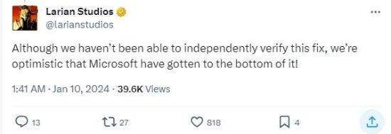 该工作室补充道:“虽然我们还不能独立验证这个修复,但我们乐观地认为微软已经找到了问题的根源!”