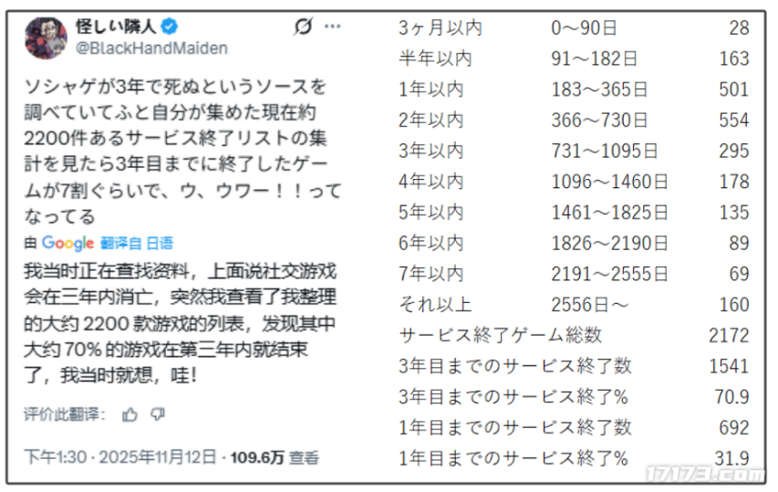 据日本游戏编辑统计,2022至2025年间上线的2197款服务型游戏,70.9%(1558款)撑不过三年,其中31.9%(701款)活不过一年。
