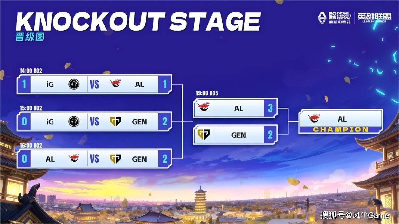 AL、GEN、IG三支战队,近日受邀参加濮院电竞节,三队以大乱斗的比赛模式,展开较量角逐冠军,首轮对抗,IG和AL都被GEN,以2:0的比分零封,AL和IG则是打成1-1,靠着时长短的优势,AL进到了决赛跟GEN打BO5,两队鏖战五局,最终AL以3:2的比分,击败GEN拿下电竞节冠军。
