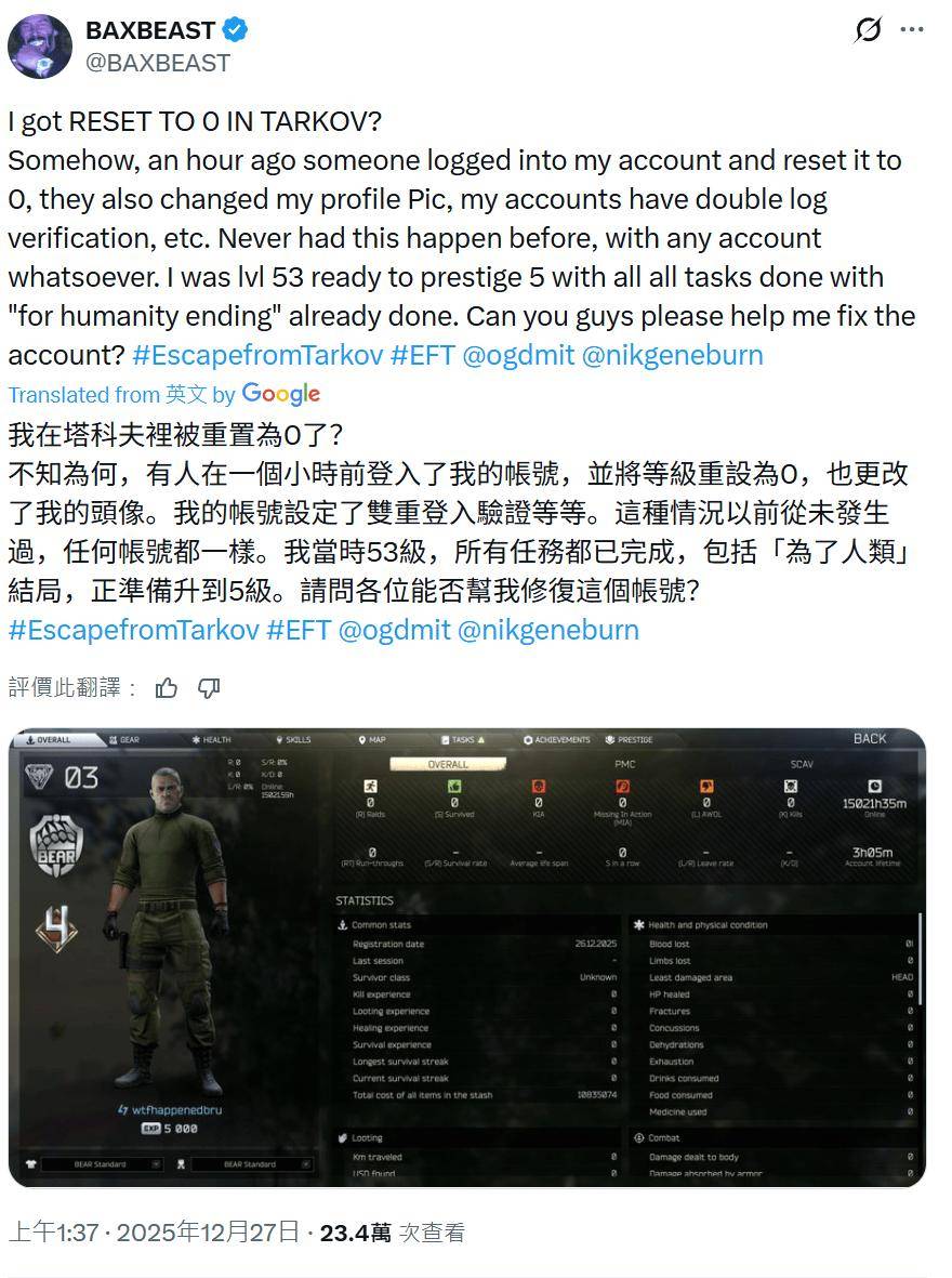 其中博主 BAXBEAST 今天在 X 平台表示,不知为何有人登录了他的账号,并将角色等级更改为 0、重设头像,他的账号已经设置了双重验证,并且以前从未发生过类似现象,他当时的角色等级已经达到了 53 级,完成了所有任务。