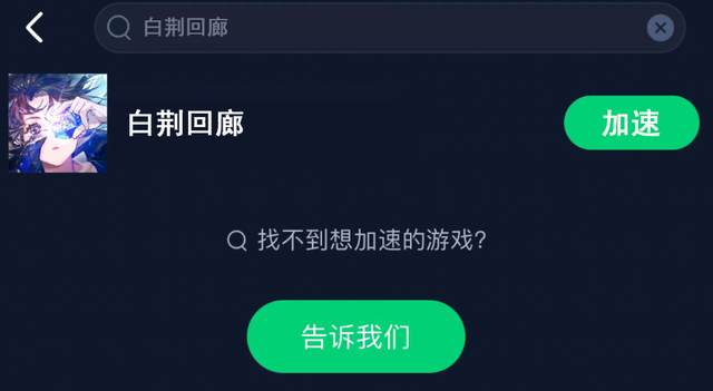 接下来我们就可以进入到App中搜索白荆回廊了,搜索后可以看到加速按钮,点击加速即可享受0延迟不卡顿的游戏体验,告别开服拥挤、服务器链接异常等情况。