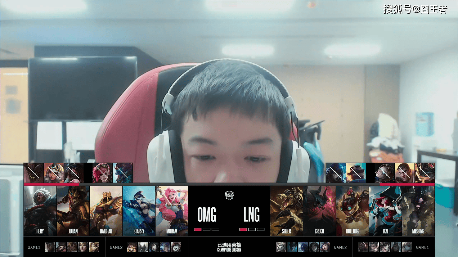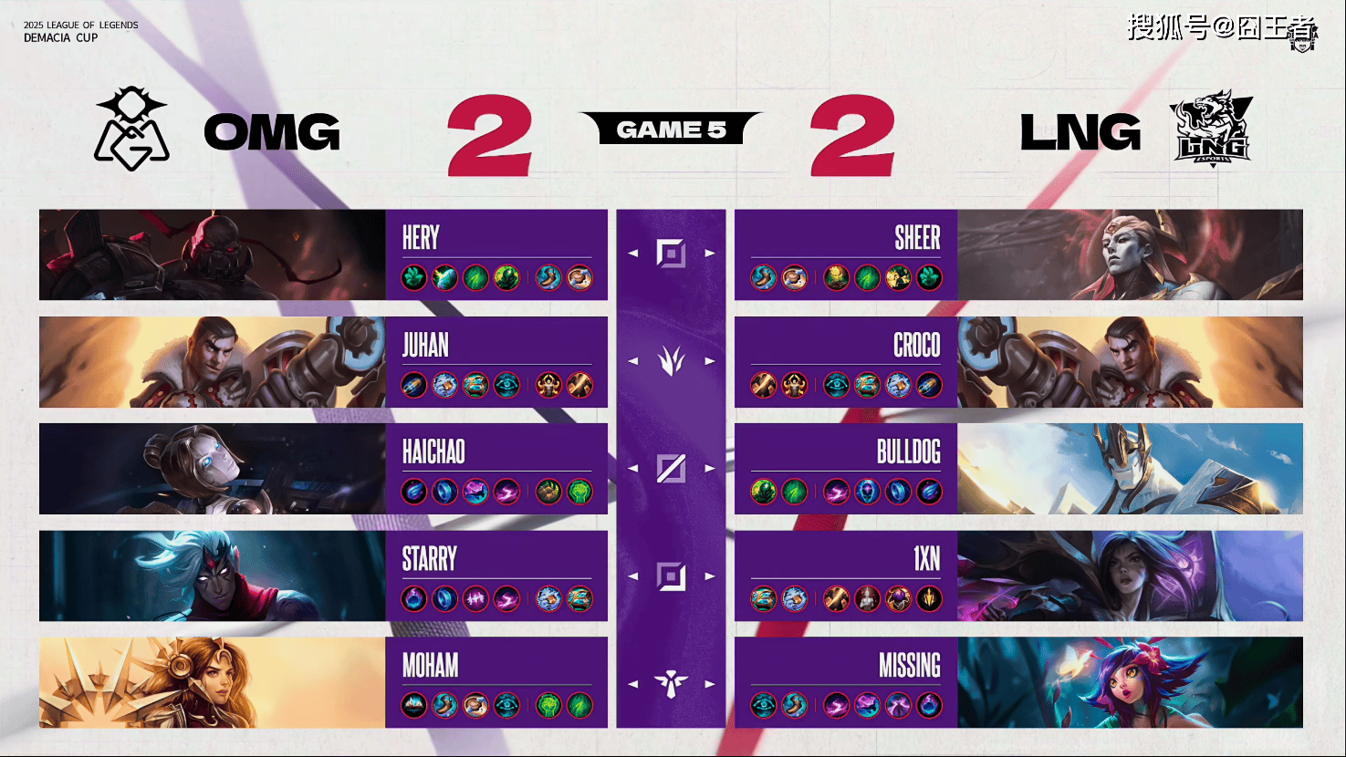 决胜局,OMG蓝色方,选用:Hery塞恩、Juhan杰斯、Haichao发条、Starry韦鲁斯、Moham日女;LNG红色方,选用:Sheer亚恒、Croco杰斯、Bulldog加里奥、1xn卡莎、Missing妮蔻