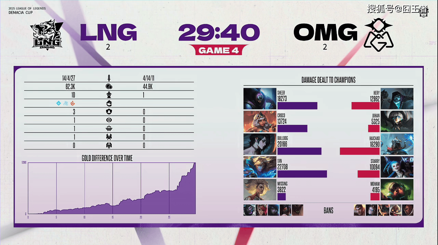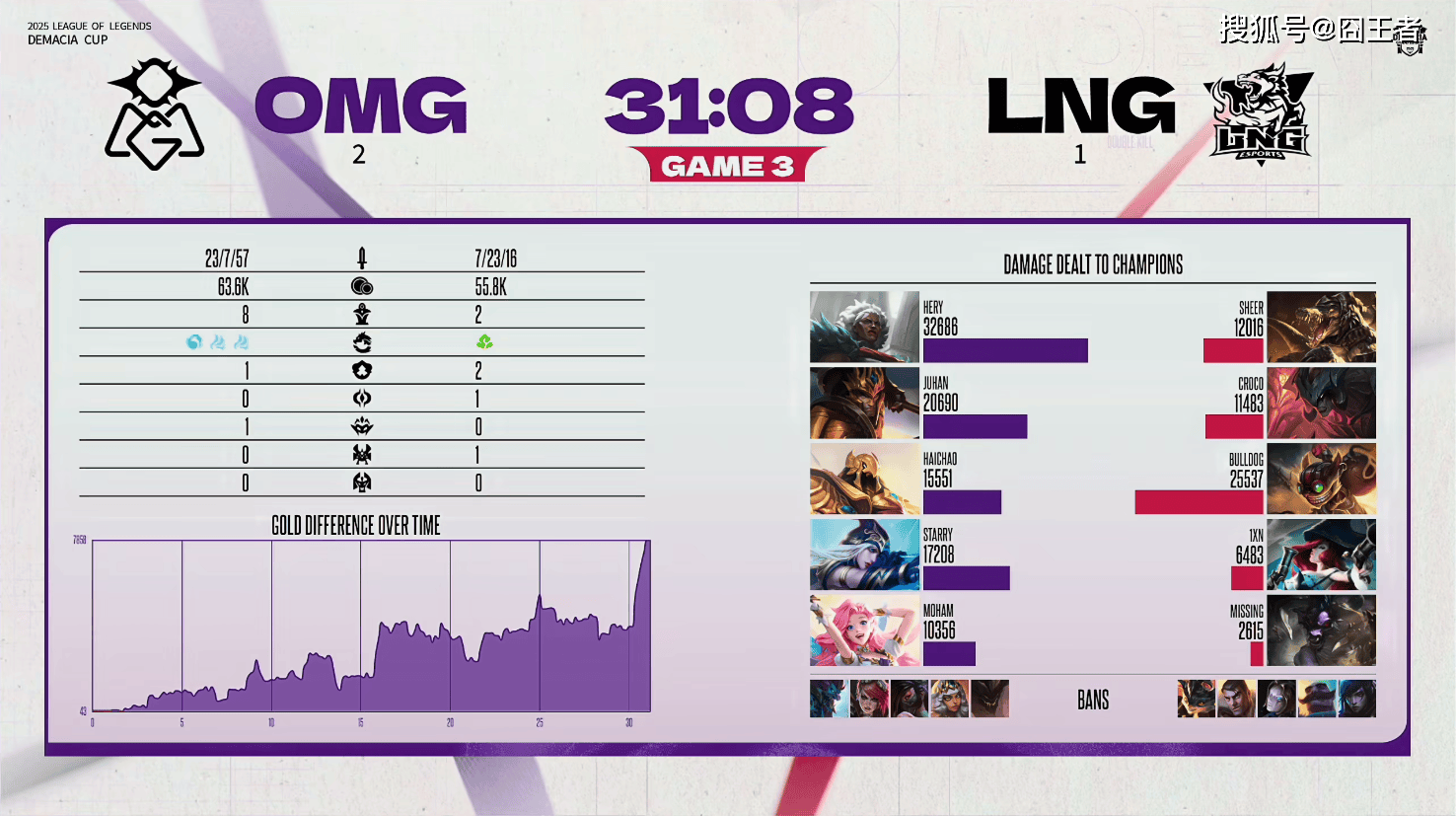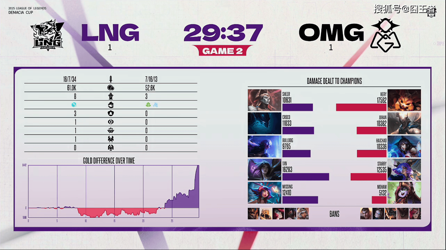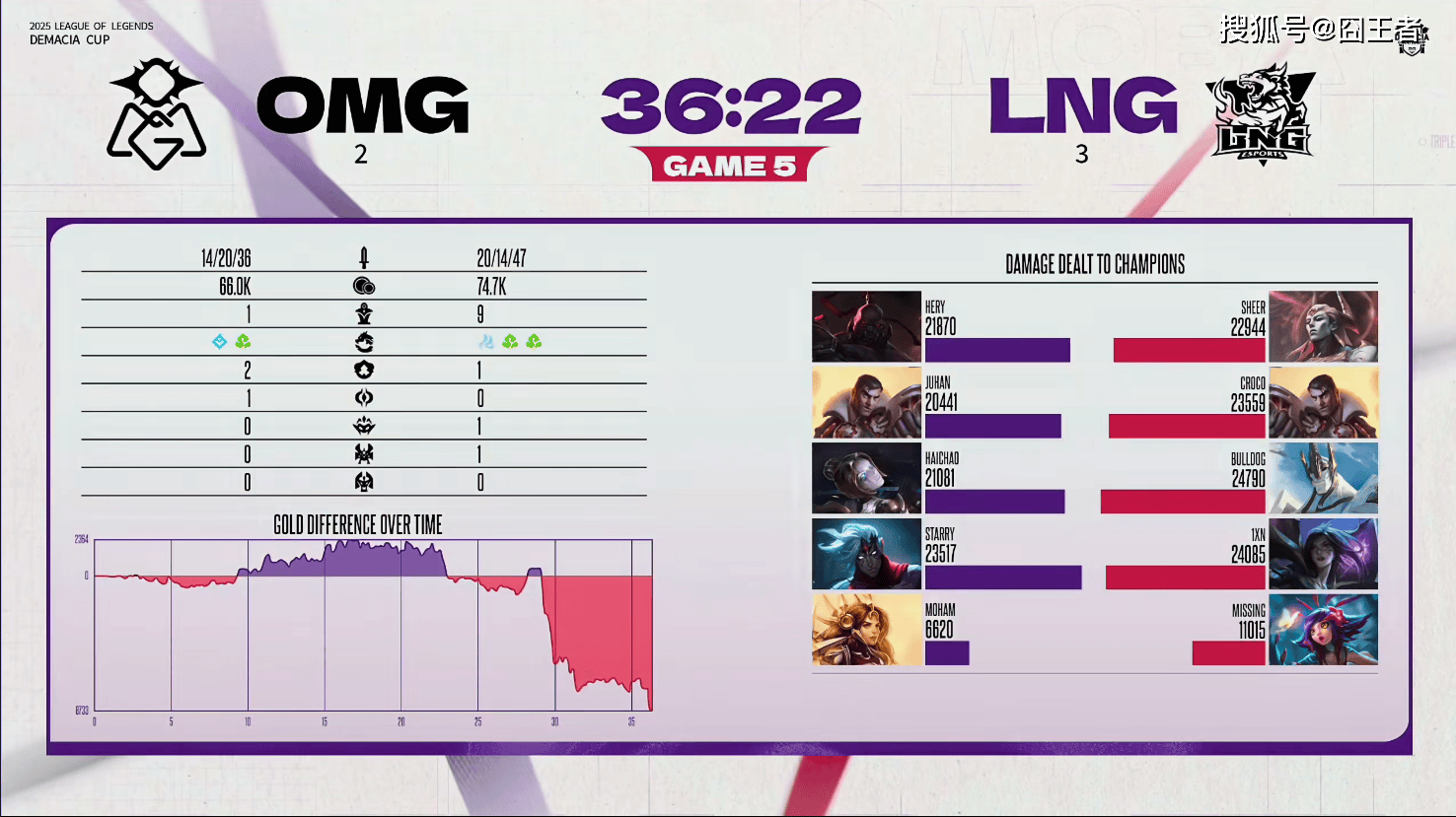 结果决胜局中,两队各打了半场好局,LNG笑到了最后。5分钟左右,塞恩在下路单吃卡莎,后续被亚恒收掉;9分钟左右,韦鲁斯在上路拿下三杀,OMG整体打出2换3;14分钟左右,OMG在河道打出0换2,韦鲁斯拿下双杀,随后拿下小龙;22分钟左右,OMG下路突然给出机会,被打出0换3;28分钟左右,OMG击杀LNG野辅,随后LNG找到机会反打打出1换3拿下大龙;30分钟左右,LNG在野区打出1换3;最终36分22秒,LNG中路打出2换4,随后顺利一波,赢下比赛。