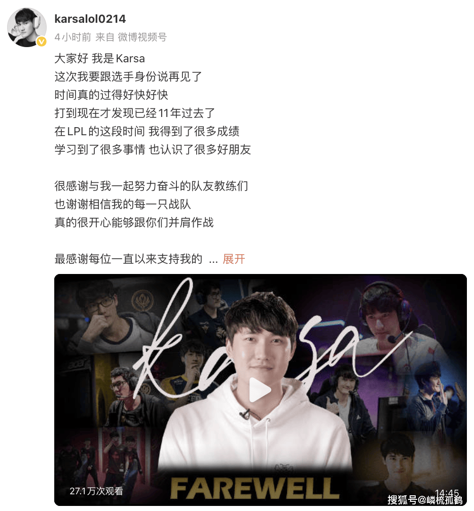即将步入新年的当下,前RNG打野,闪电狼名宿Karsa正式官宣退役。