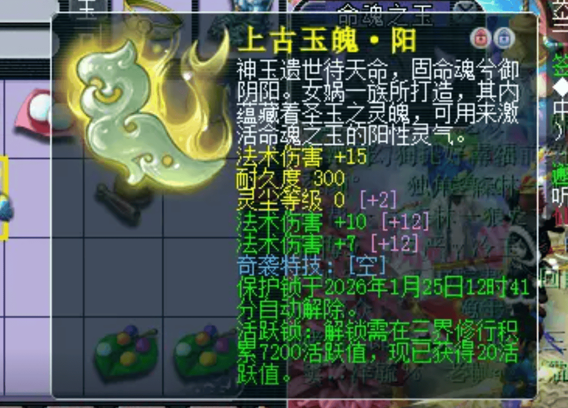昨夜,一位少侠在魂铸任务中斩获一枚前排玉魄,其罕见之处在于三条属性均为法伤。玉魄本身已自带2级灵尘,法伤加成高达56点。若将其镶嵌至15锻极限,总法伤属性将飙升至236点——该数值已逼近属性上限,足以排入全服法系玉魄榜前三的位置。