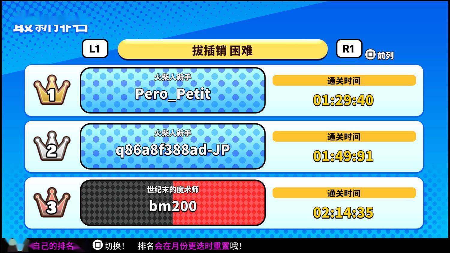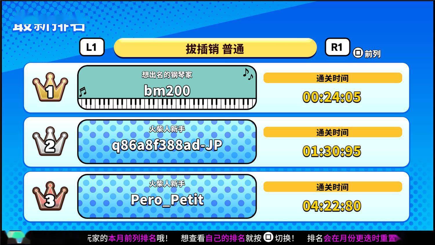 排行榜包括各种小游戏的单独排行榜和5种小游戏的综合排行榜,每种排行榜又各自分为“简单”、 “普通” 、“困难”级别。※排名将于每月1日重置。