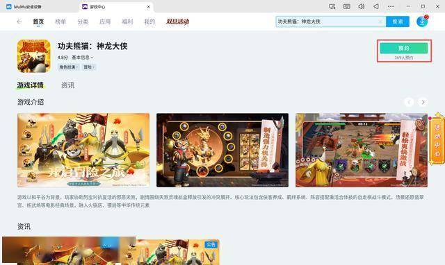 方法一:打开游戏中心或直接在搜索框搜索功夫熊猫:神龙大侠,点击预约,游戏上线后游戏将自动下载;