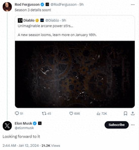 第一暴白?马斯克再次表达对《暗黑4》新赛季的期待
