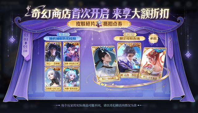 奇幻商店将在1月1日首次开启,在里面可以刷出限定皮肤和抽取随机折扣,其中谪仙醉月、苍雷引、浮光幕影必定刷出。其次,每款皮肤最多可用五个皮肤碎片抵扣50点券,限定皮肤最低为8折,其它皮肤最低为5折。