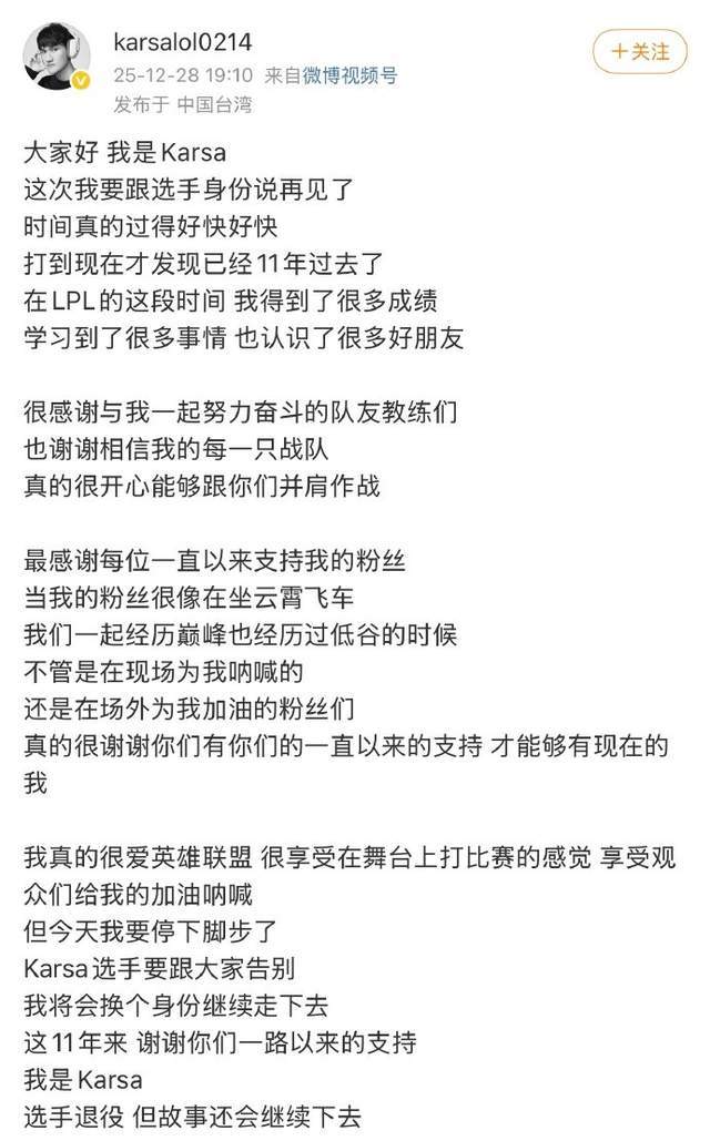 在社媒发布的长文中,Karsa在开头就直入主题:“这次我要跟选手身份说再见了。”随后他表示不知不觉自己已经打了11年的职业,在LPL赛区打比赛的那段时间他也取得了很多成绩,结交了很多朋友,他对自己此前的队友、教练以及队伍表达了感谢。
