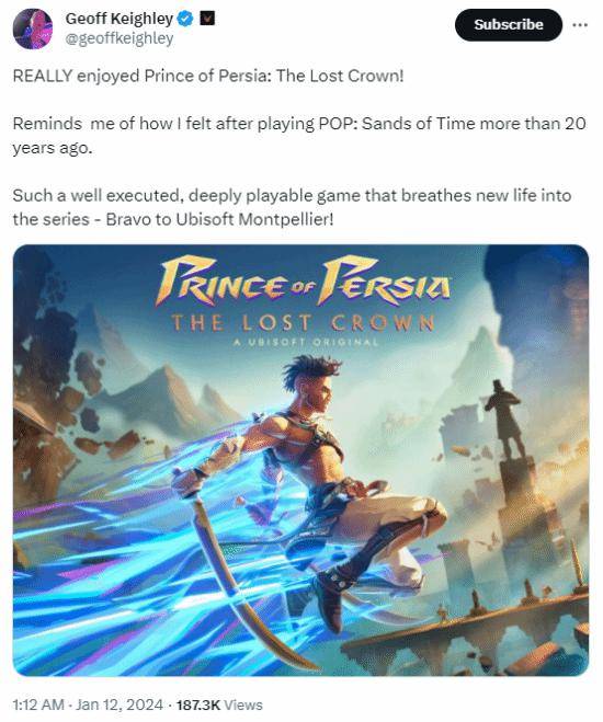 《波斯王子:失落王冠》口碑已解禁,M站媒体均分86分,试玩Demo也已上线。TGA主持人Geoff Keighley今日发推称赞了这部作品。