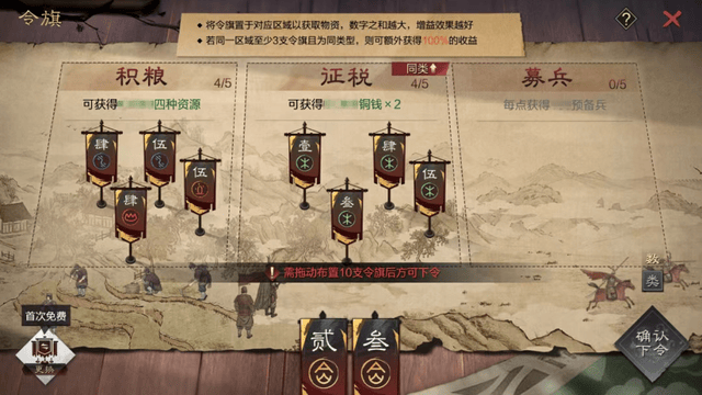 当然,光会地形还不够,后勤才是持久战的关键,粮草兵力要供给到位。赛季里新增 “五色令旗” 玩法搞后勤。每天领10支令旗,分配到积粮、征税、募兵里,要是3支令旗同类型,资源还能翻倍,像刘备那样粮草充沛、兵强马壮。