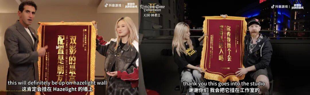 像抖音游戏区的知名创作者“贪玩歌姬小宁子”,就先后采访了《双影奇境》的制作人Josef Fares和《天国拯救2》的全球公关经理Sir Tobi这两位中国玩家的老熟人,并送上了不同的锦旗。