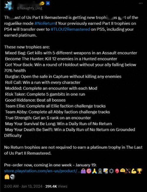 顽皮狗官方今日发布公告,详细讲解了《最后生还者2:复刻版》的游戏奖杯情况,列举了这些奖杯的获取条件,并表示获得白金并不需要《No Return》奖杯。