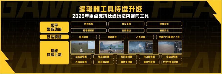 所以,“绿洲启元”做了一整套的PC编辑器,开放了许多美术素材,以及在本体玩法中已经被验证和优化成熟的功能模块,同时也提供对应的使用课程,把开发成本降得很低。