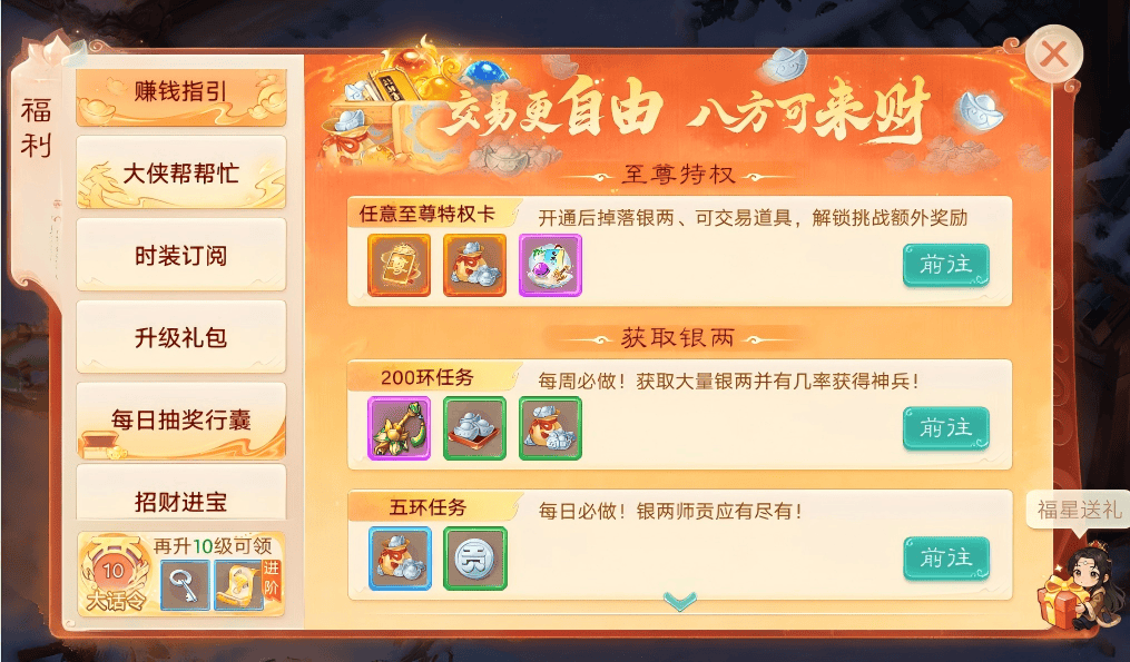 不知道大家有没有留意到,在福利——赚钱指引那里,官方已经清晰列出了获取银两的各大途径,首先开通任意至尊特权卡,激活六大特权后,每日会掉落银两袋、见闻录等可交易道具;