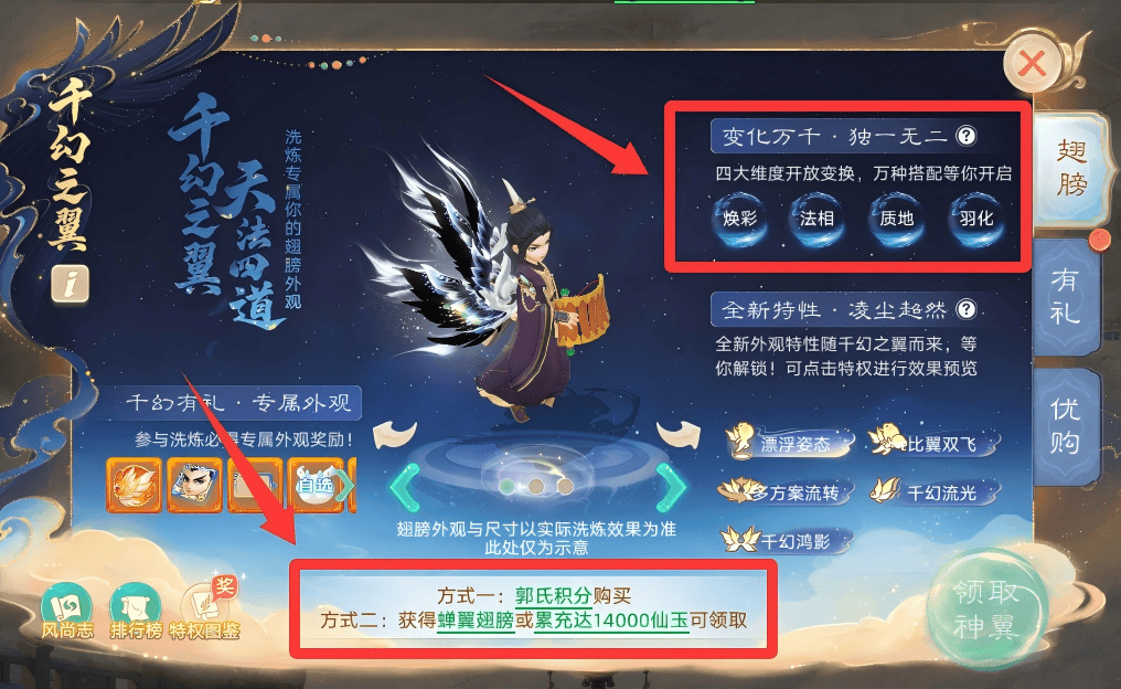 与此同时,大话首款自定义翅膀“千幻之翼”也闪亮登场,外观党狂喜,作为首款可洗炼翅膀,千幻之翼拥有四大词条属性,配色、特效、尺寸和材质全由你定义,万千变化独一无二,绝对可以让你拥有最心水的专属外观!