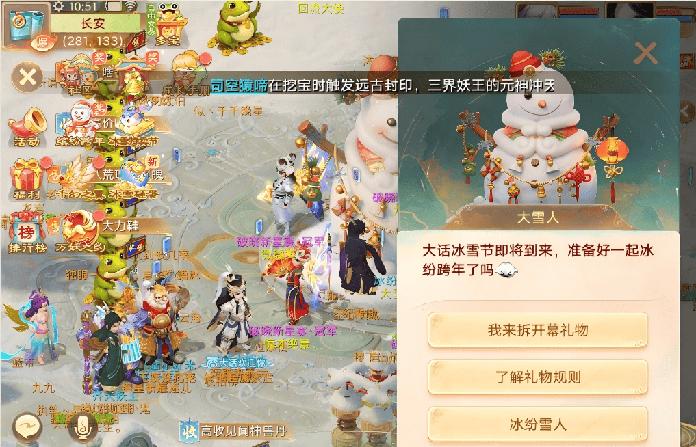 12月25日,冰雪特卖节、缤纷跨年活动开启,在这里你可以堆雪人、打雪仗、与小伙伴互换礼物,一起跨年倒数欣赏烟花盛典;冰雪特卖节还有全新时装岁寒三友、龙兔座驾幻肤、筋斗云座驾幻肤等放出,想要美美过年的姐妹们可以装扮起来了!
