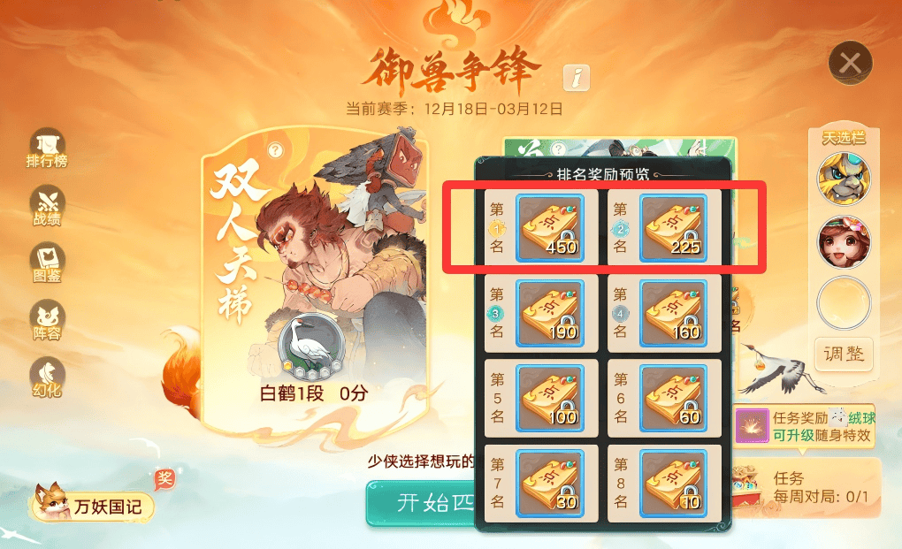 不仅如此,御兽争锋除了让玩家体验到回合策略竞技乐趣,还能赚到点数开特权月卡。在自由交易服,你完全可以通过斗技赛来获得排名奖励,每一局都有不同点数的奖励,第一名450点数、第二名225点数...只要力争第一,连胜四场净赚1000多点数,一张月卡到手了!