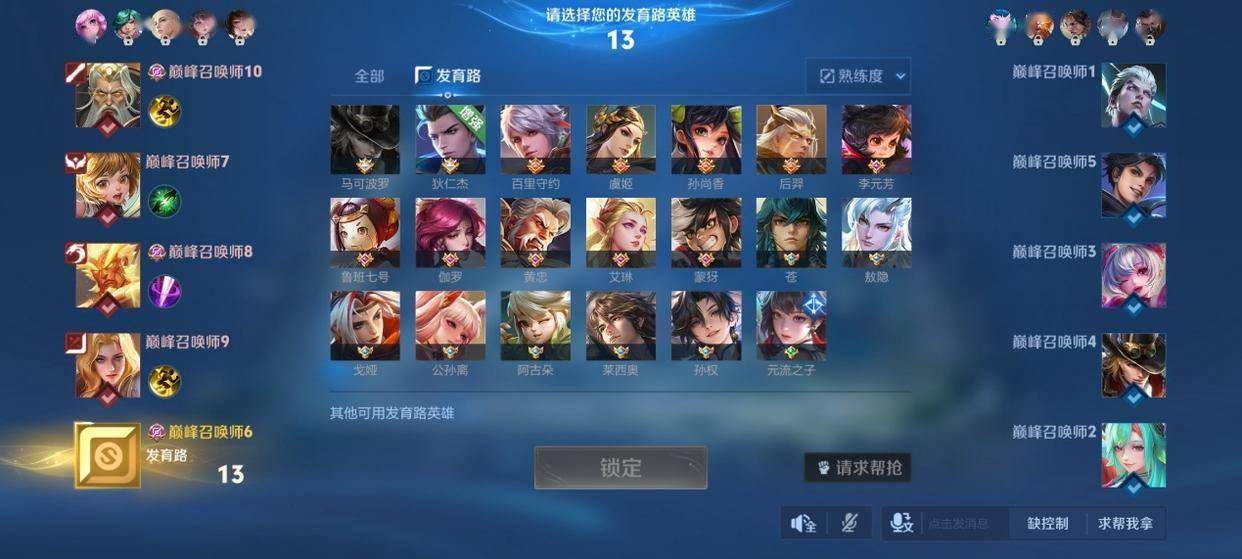 这局补位发育路,我方阵容可以说控制能力,开团能力都一般,前排是两个战士,还不是特别能抗的那种,好在有一个孙膑还能强化一手。这种情况我们尽量选一个能够自理的射手。
