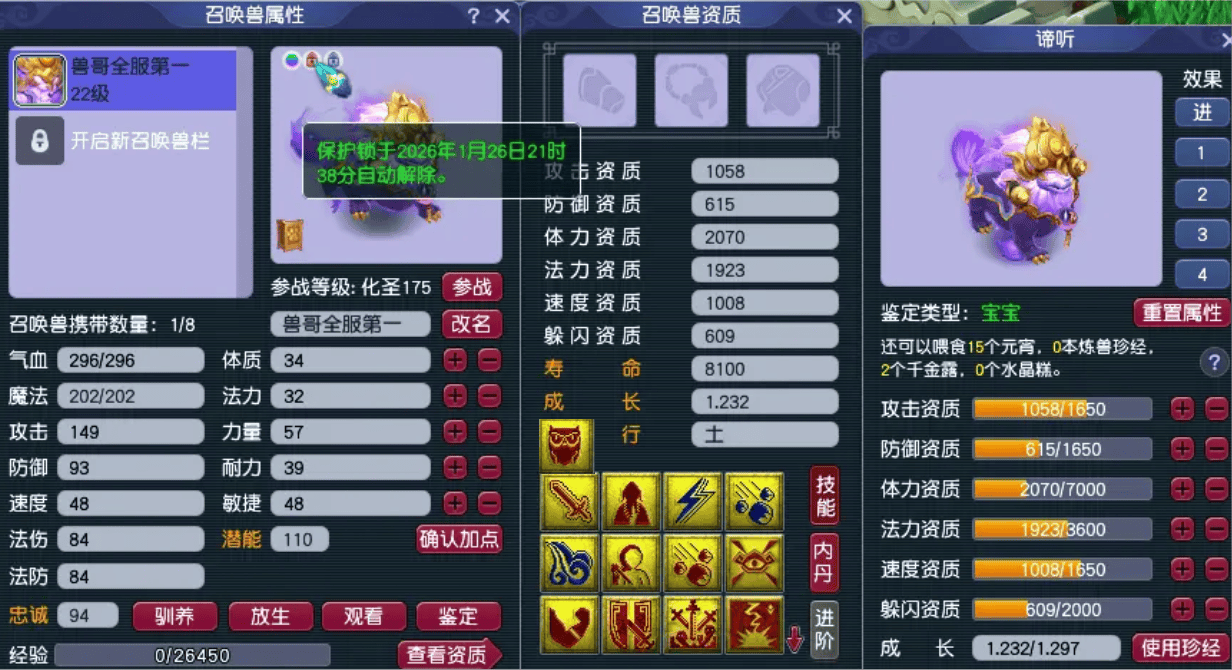 最近,主播兽哥亲自操刀,成功合出一只13技能、拥有观照万象与剑荡四方双特殊的谛听。虽然目前资质一般,技能也处于半成品状态——一半物理、一半法术混杂,但凭借其特殊技能组合,最适合的路线仍是向物理攻宠发展。