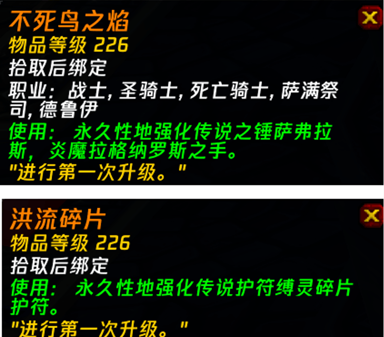 P2上线后,玩家从MC获得的橙锤【萨弗拉斯,炎魔拉格纳罗斯之手】和橙脖【缚魂碎片护符】均可以使用橙色物品升级到226装等。