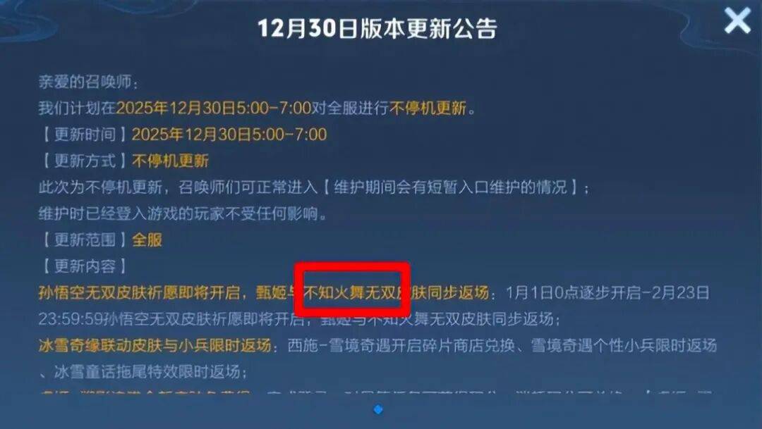 不知火舞的返场消息,可能并非文案错误。因为瑶真我赫兹在甄姬雪镜奇遇上线之时就已经陪跑过了。也就是说,已经有过一次返场了。本来机会应该是给其他无双皮肤了。没想到这一次再次跟甄姬雪镜奇遇绑在了一起。